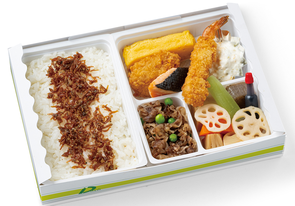 黒毛和牛、ちりめん山椒、チキンカツ、エビフライ、玉子焼き、煮物、タルタルソース、