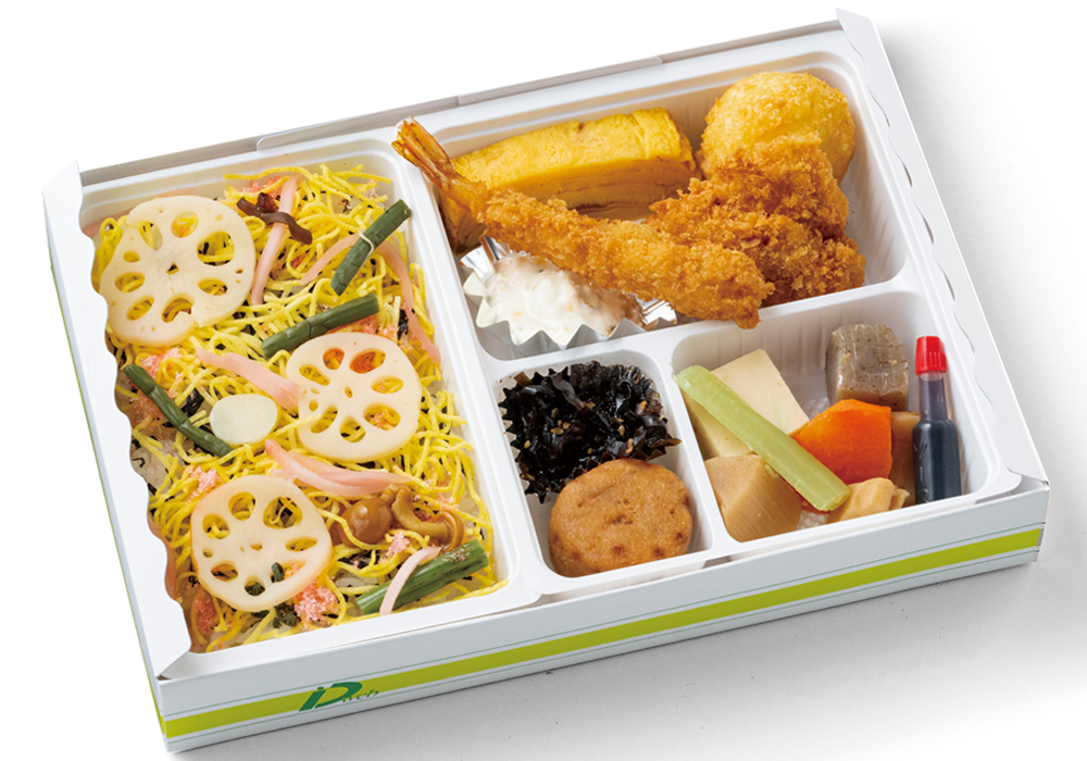 ちらし寿司(錦糸卵、海苔、山菜、レンコン、桜でんぶ)、海老フライ、鶏もも肉フライ、